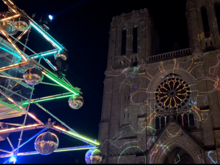 Ce contexte a guidé chaque étape de la conception technique et artistique : de l’installation d’une structure sapin de dix mètres de haut, pensée comme un élément central captivant, à l’intégration de boules à facettes et de pixel-mapping dynamique qui dialoguent avec la façade de l’église Saint-Germain.