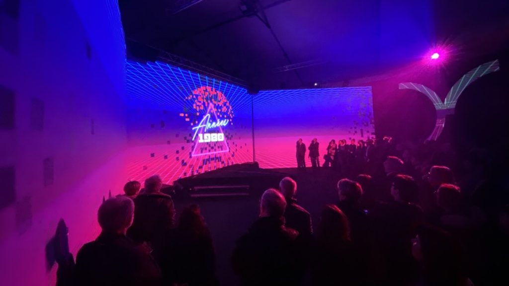 Pour répondre à cette intention, le projet s’est articulé autour d’une structure hexagonale immersive, spécialement conçue pour accueillir un spectacle vidéo à grande échelle. Ce choix scénographique permettait d’installer le public au cœur de l’expérience, entouré de surfaces de projection synchronisées. Chaque face devenait un support de narration, offrant une lecture dynamique et évolutive du contenu, tout en renforçant la dimension collective de l’événement.
